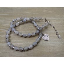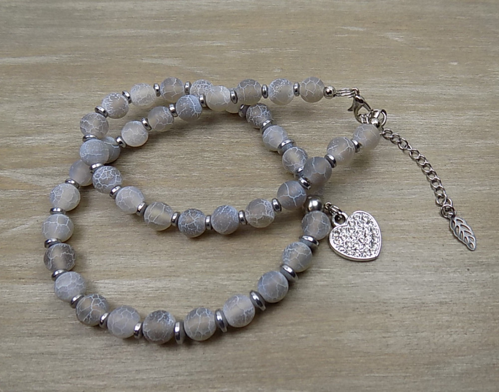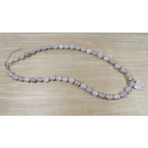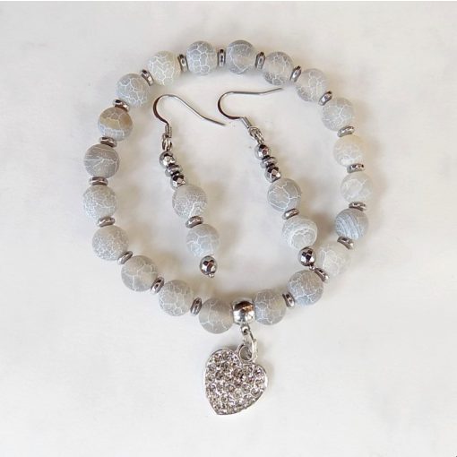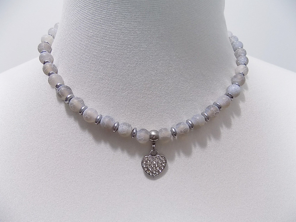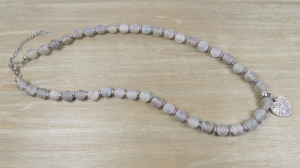 Anyaga: szürke matt repesztett achát, hematit köztes gyöngyökkel, mikrostrassz szív medállal. A lánchosszabbító nemesacél, a fém részek ólom és nikkelmentes antiallergén anyagból készültek.