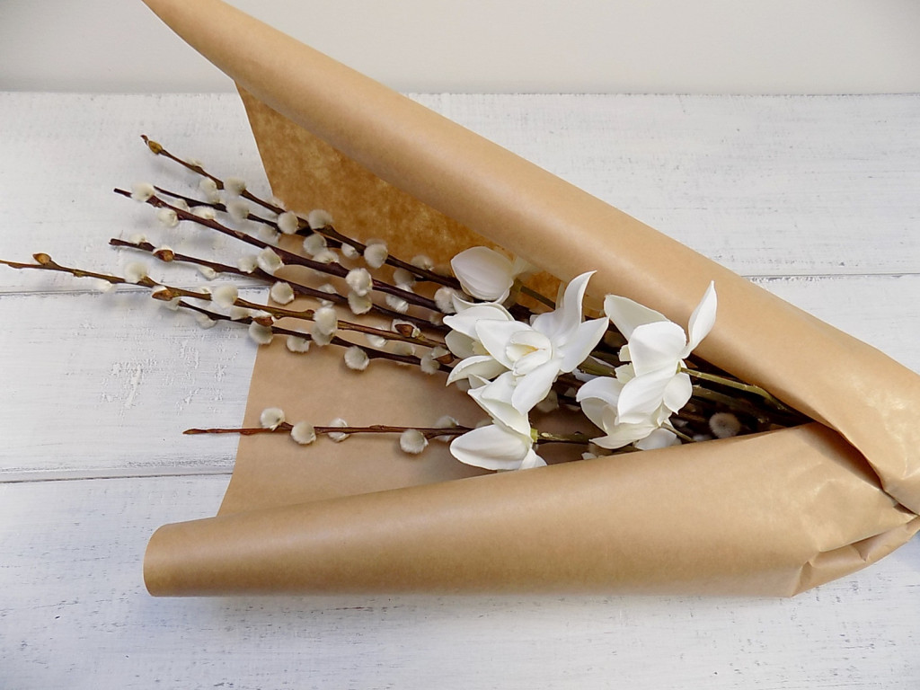 Különleges szépségű, természetes barka csokor mellé, fehér nárciszcsokrot csomagoltunk.